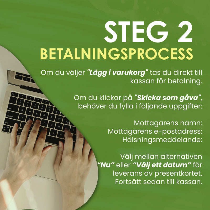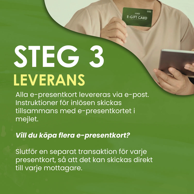 Om du väljer samma dag som leverans skickas presentkortet inom 24 timmar. Om du väljer ett senare datum skickas det på det valda datumet.